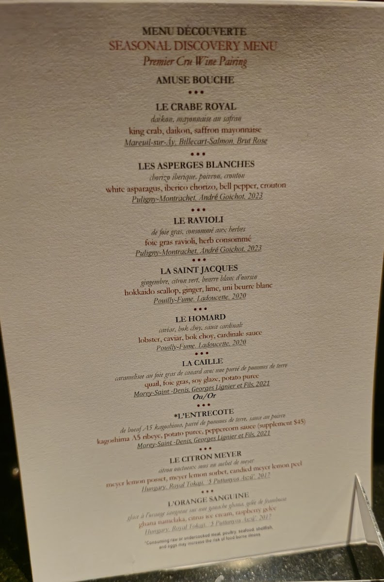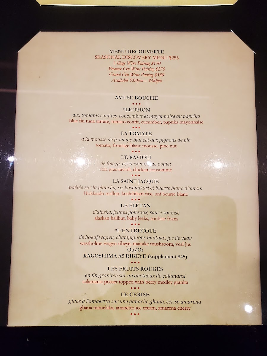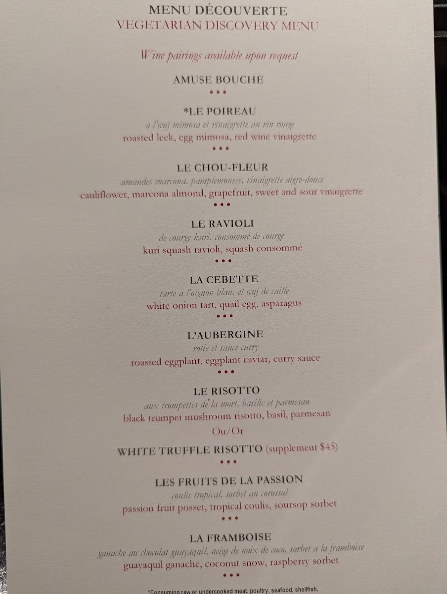 In addition to savory courses, the menu includes a selection of desserts like sorbet with blueberry compote, chocolate-based dishes, and traditional French-style birthday cake. The menu often features multi-course tasting menus suitable for extended dining experiences that showcase various culinary techniques.